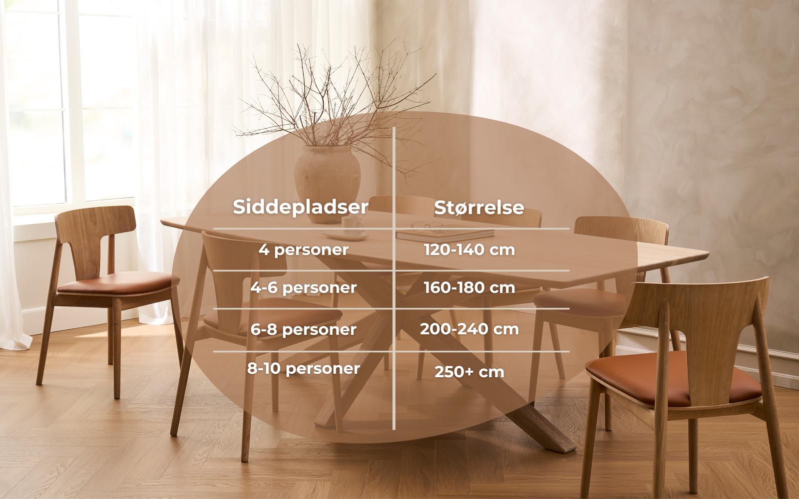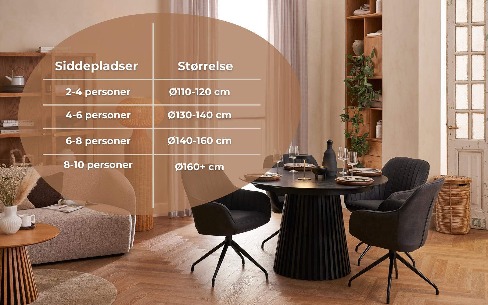 Et rundt bord på 160 cm i diameter er et fantastisk valg, hvis du tit har gæster. Har du et rundt bord på 130 cm, så regn med 4–6 personer som udgangspunkt.
