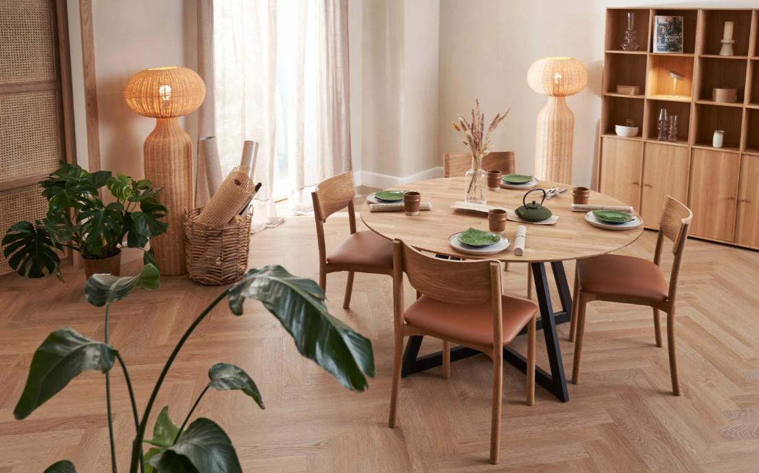 Ved at matche træfarverne på dit bord og dine stole kan du skabe en dejlig ro i hjemmet. Hvis du vil tilføje lidt ekstra personlighed og varme, kan du overveje cognacfarvet læder til et lyst egetræsbord og stole. Det giver et flot sammenspil og skaber en indbydende, hyggelig stemning, der virkelig gør rummet til dit eget.